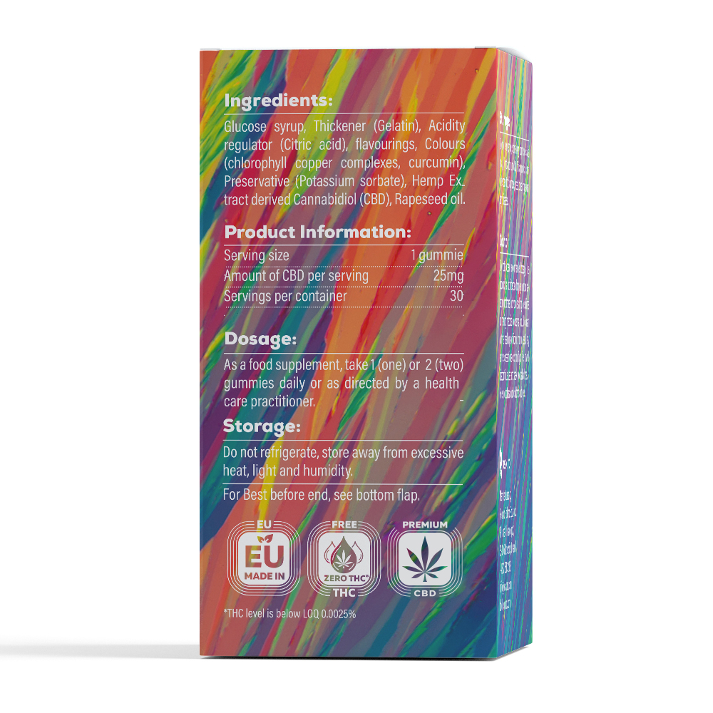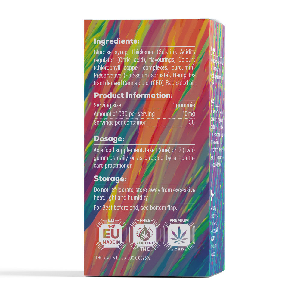 Ingrediente: sirop de glucoză, agent de îngroșare (gelatină), regulator de aciditate (acid citric), arome, coloranți (complexe de clorofilă cupru, curcumină), conservant (sorbat de potasiu), canabidiol din extract de cânepă (CBD), semințe de rapiță ulei.